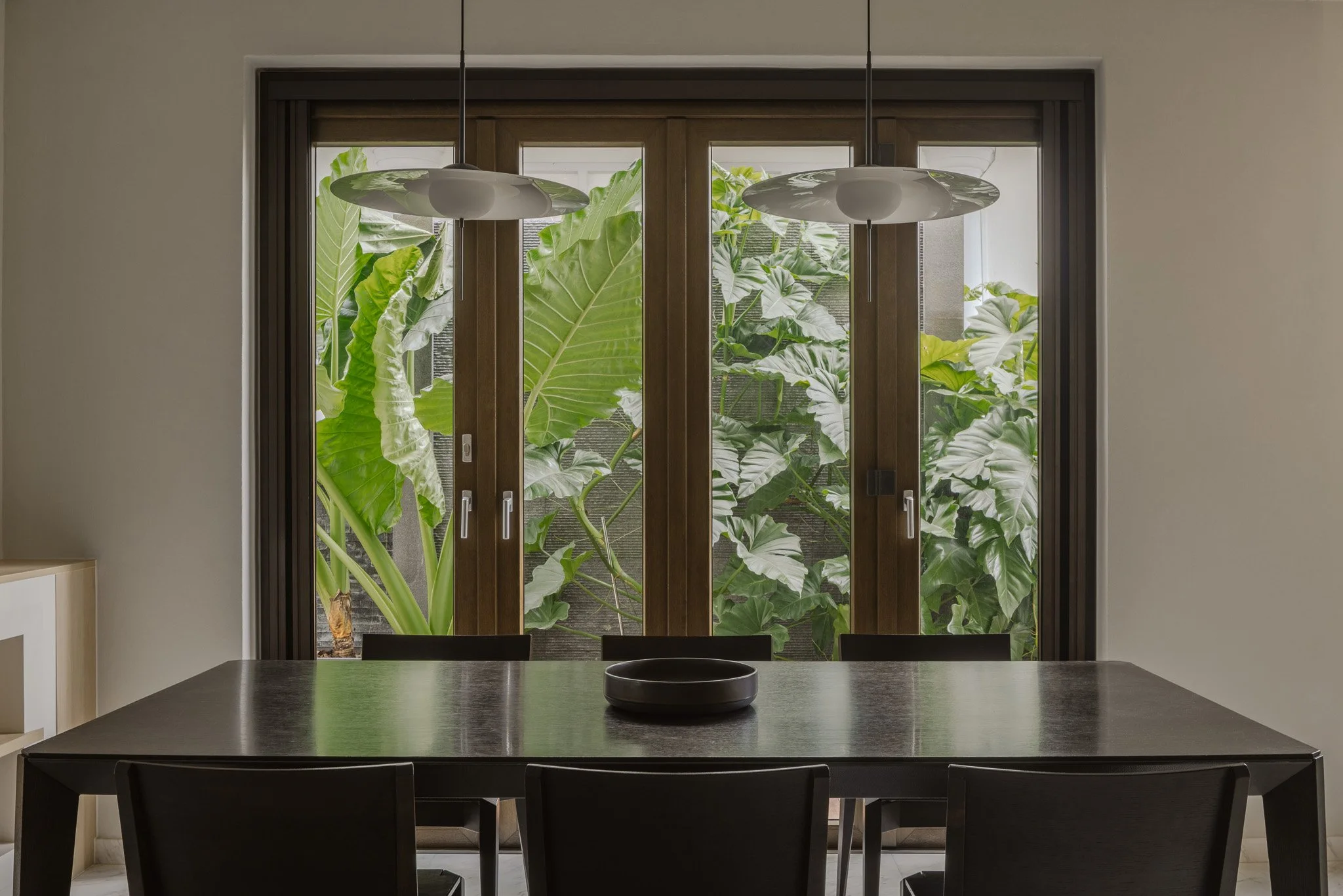 The dining area centres around a sleek dark-timber table, paired with understated pendant lights. It is a place for lingering meals, framed by views of greenery outside swaying gently in the breeze.
