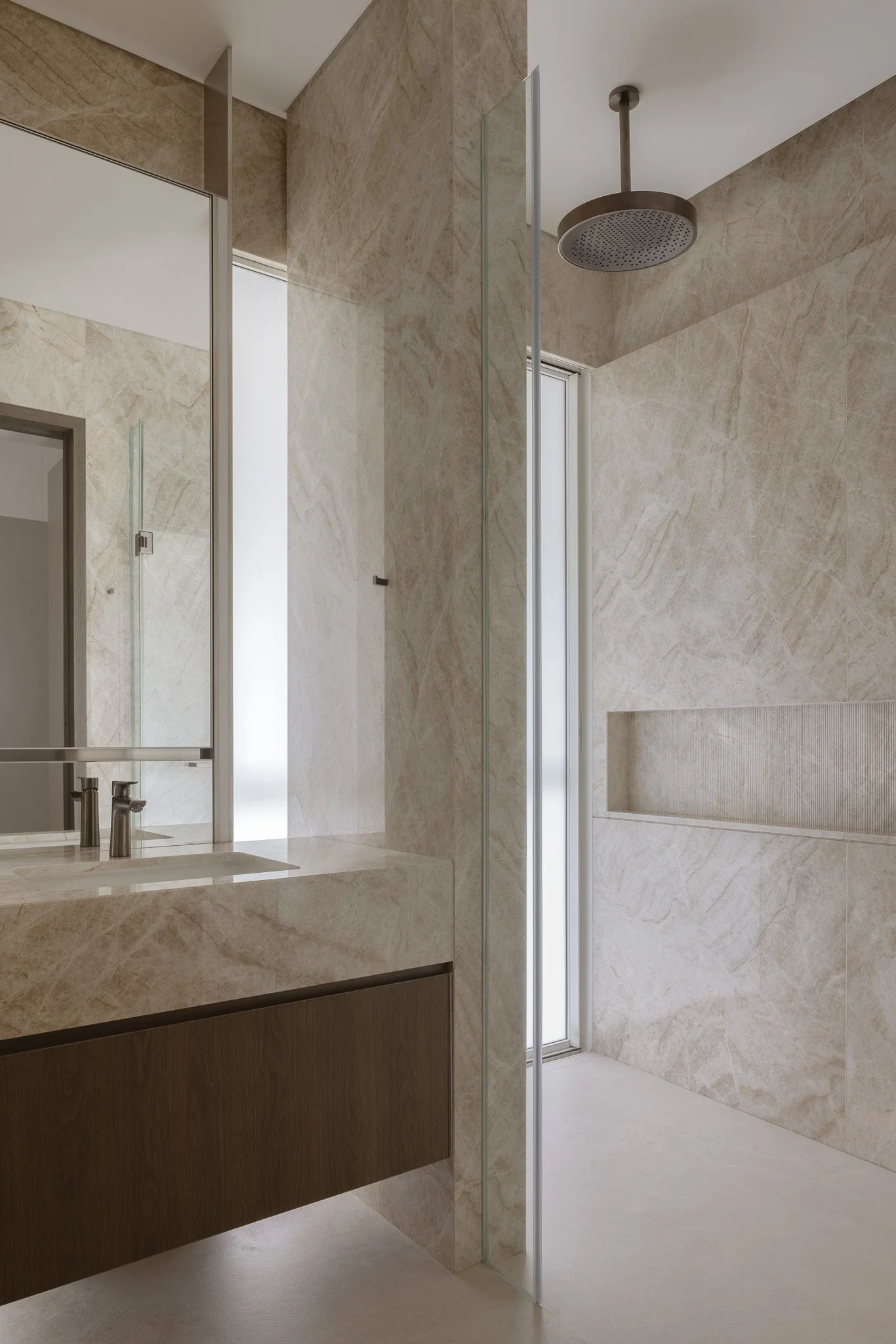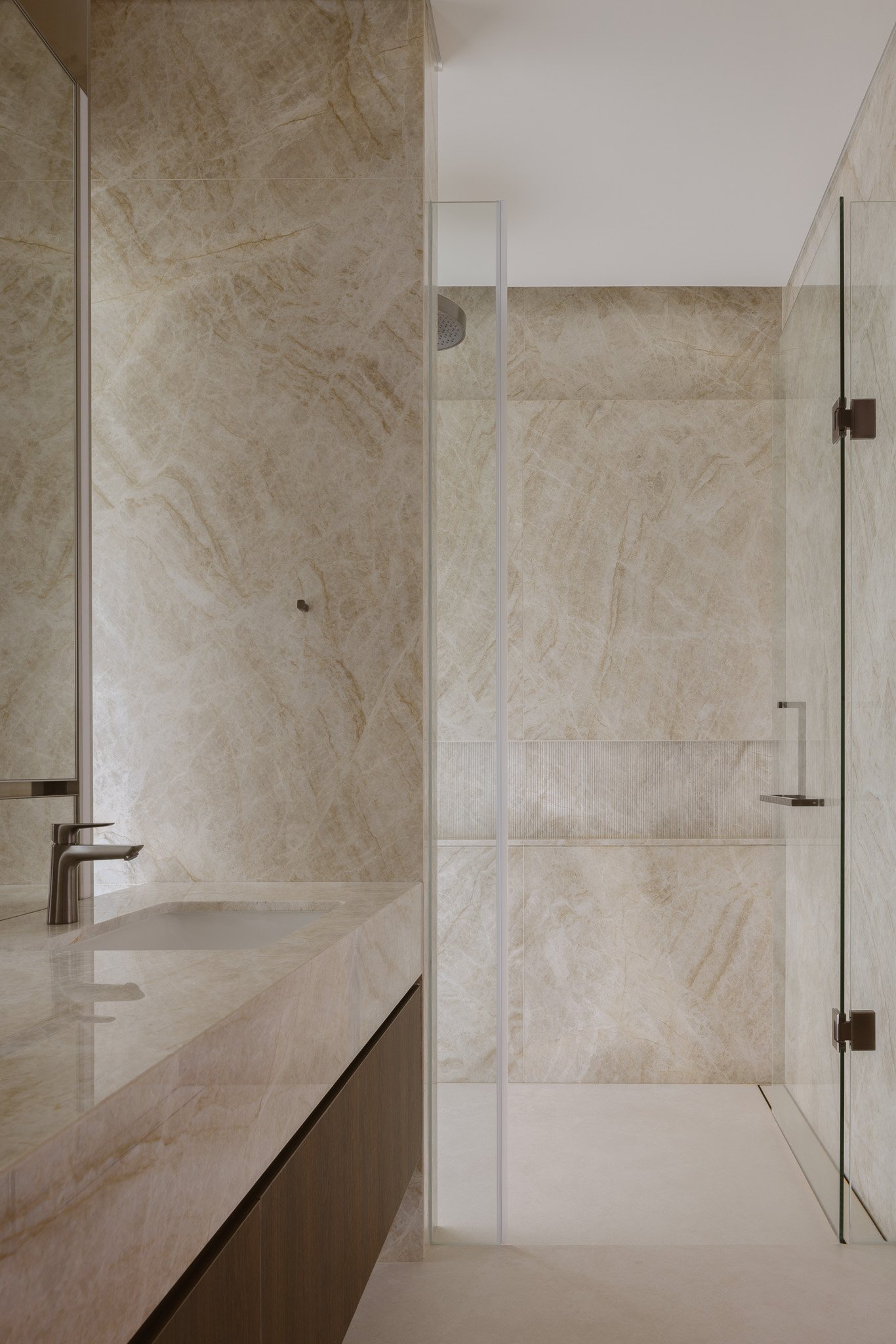 Beyond, the atmosphere deepens as the day recedes. Water traces warm stone sinks, carrying the day away in gentle ripples. Dark metal fixtures catch the fading light, casting subtle shadows over textured surfaces. Small rituals—a long bath to welcome the night, soft towels, and the calm of the space—create a serene close to the day.