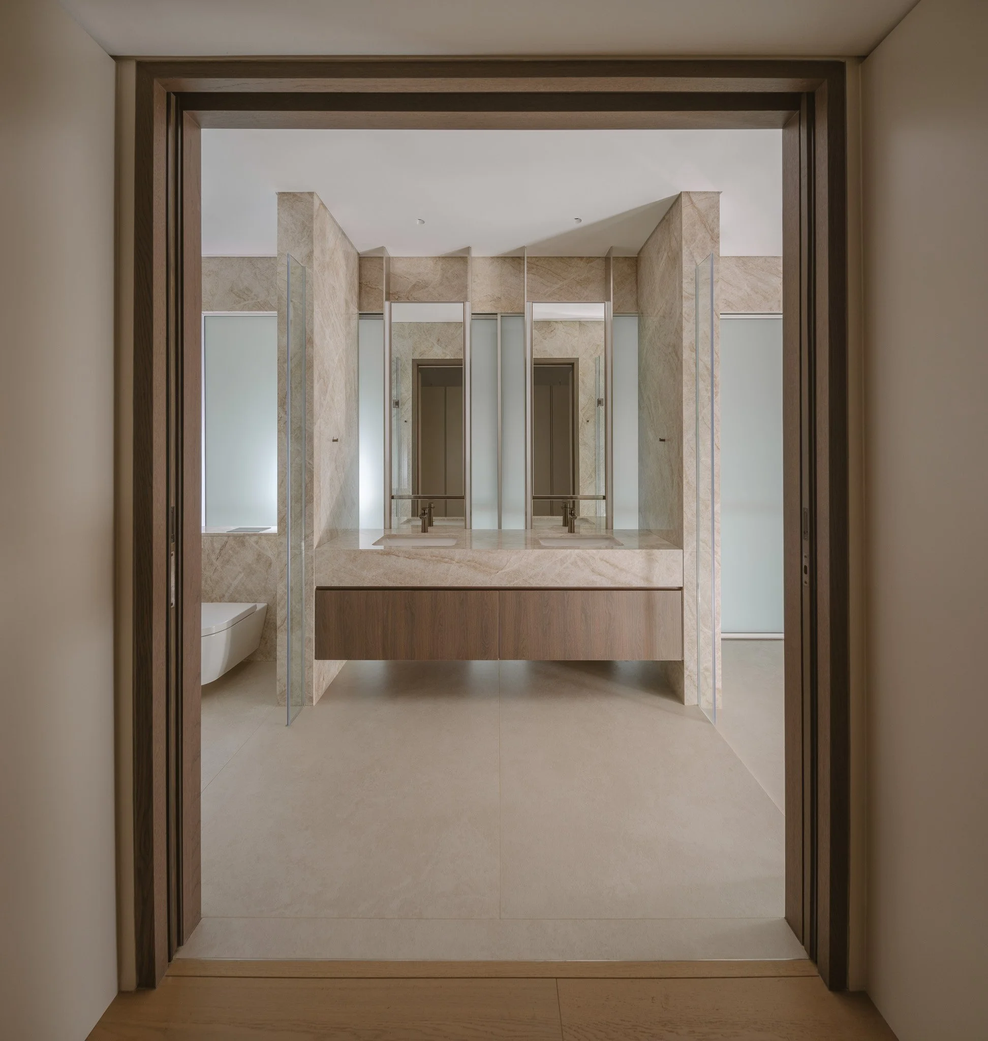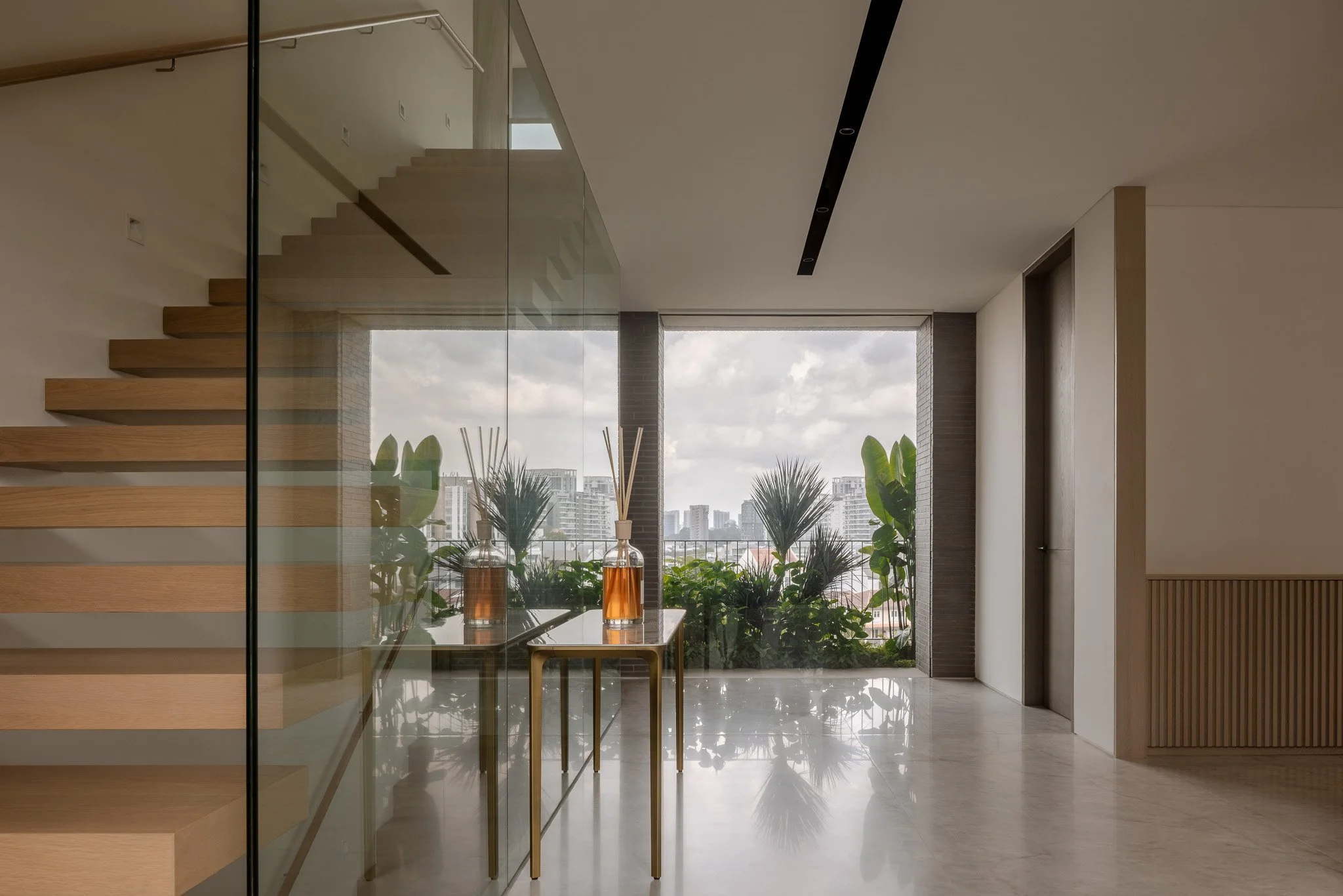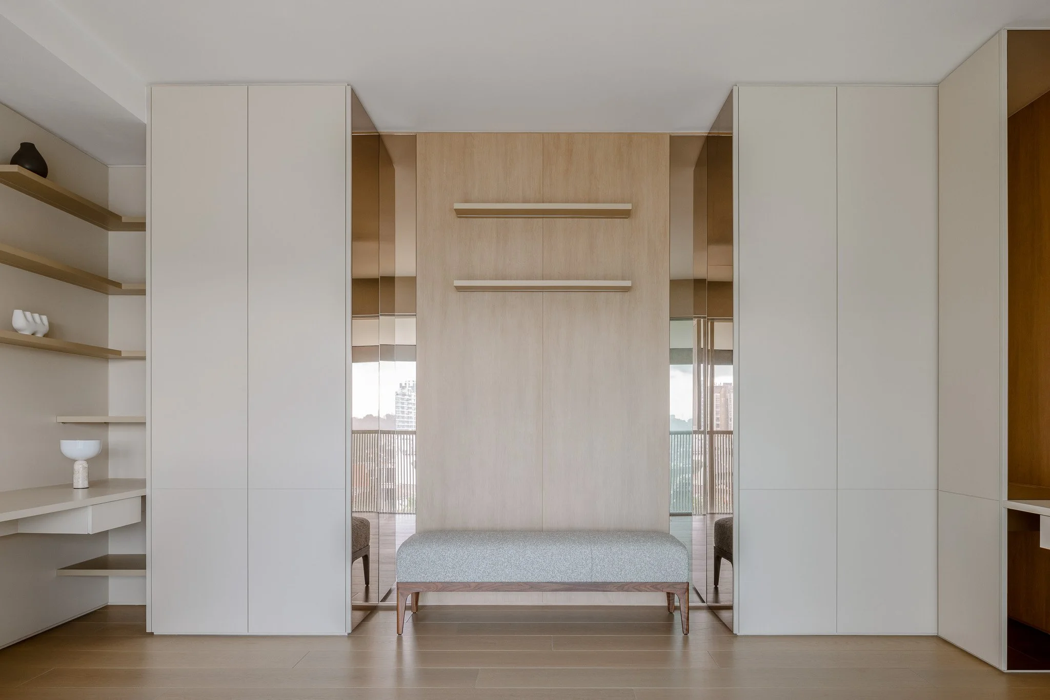 As the day wanes, the city stretches alongside the corridor, a gentle interlude guiding the path to the master suite. The volume allows the room to open and breathe, while the last light of day drifts across a bespoke console, tracing its detailing as the surface catches a soft, amber glow.