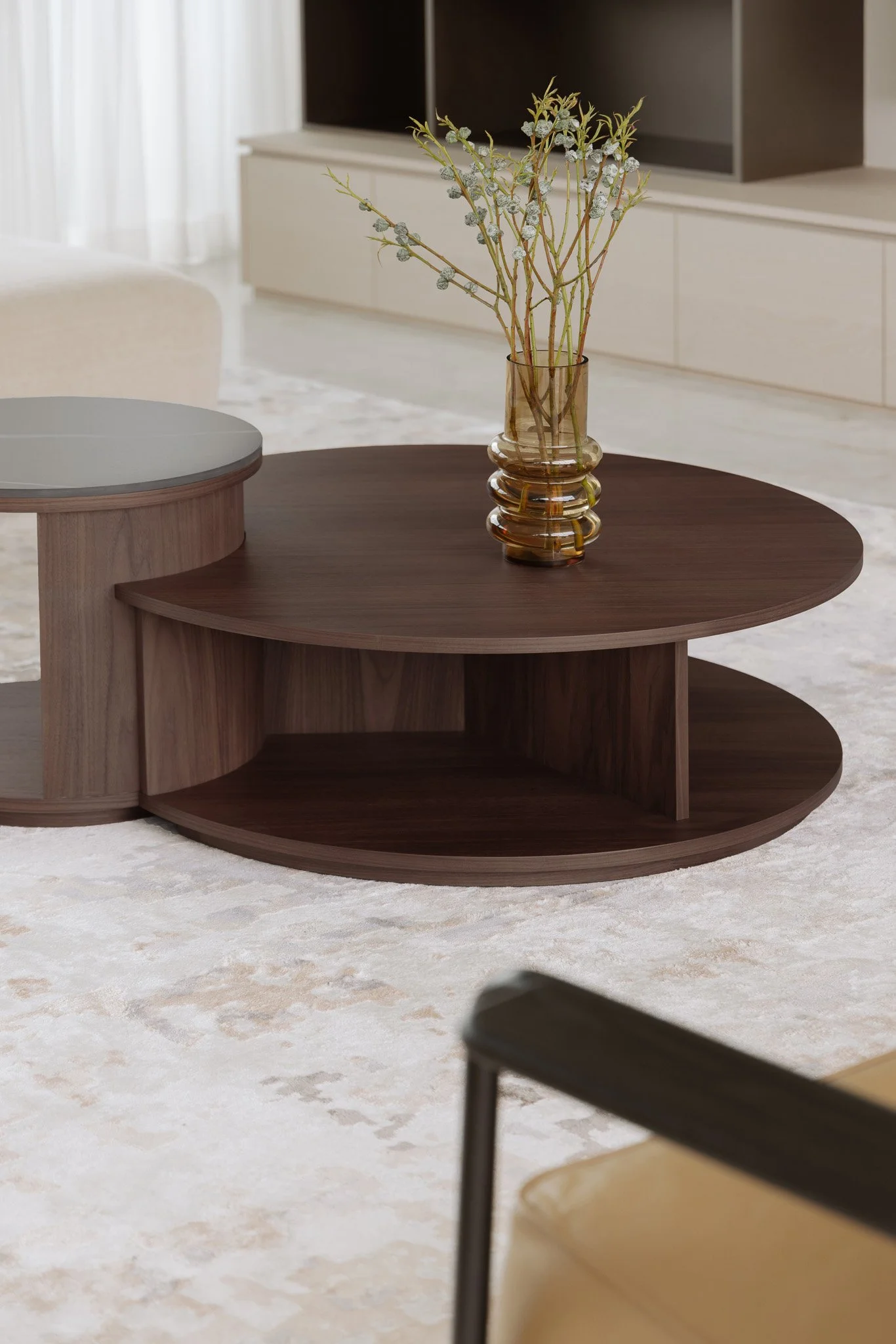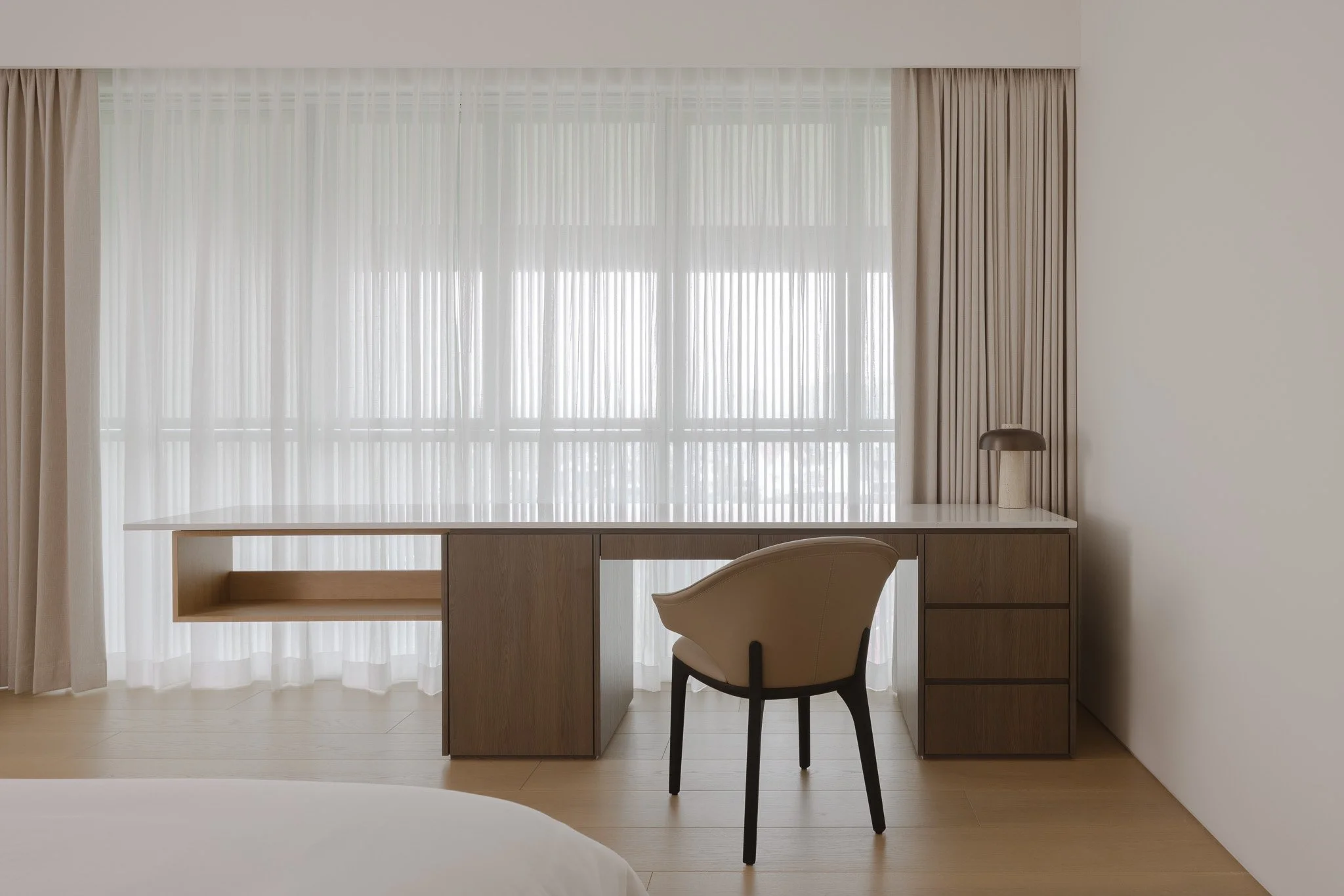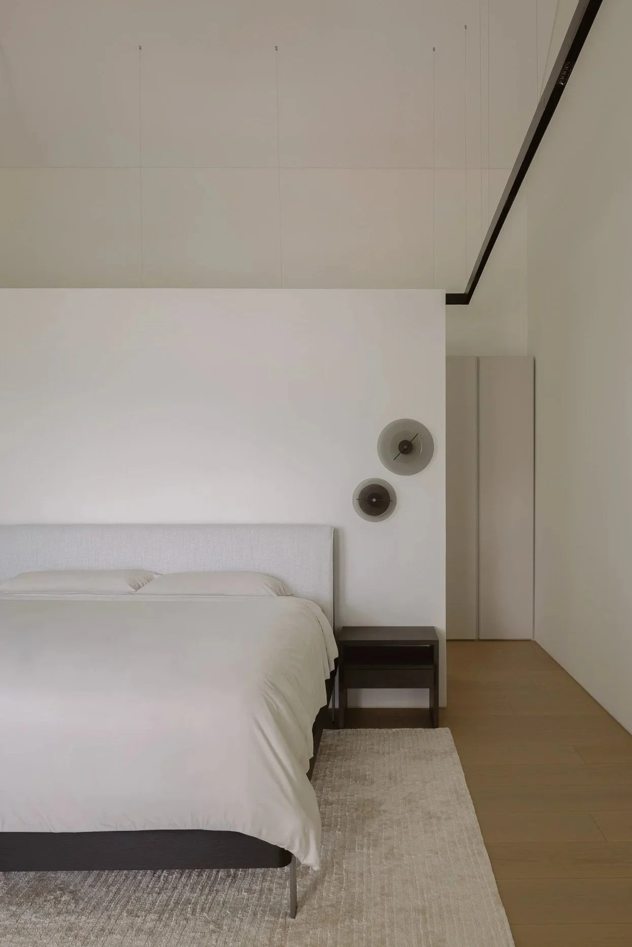 As the day wanes, the city stretches alongside the corridor, a gentle interlude guiding the path to the master suite. The volume allows the room to open and breathe, while the last light of day drifts across a bespoke console, tracing its detailing as the surface catches a soft, amber glow.