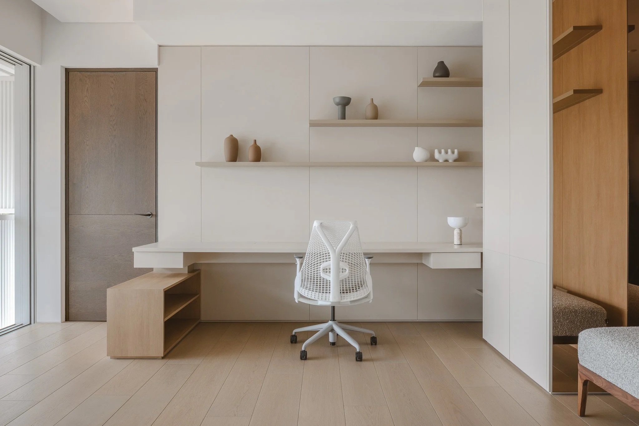 Ascending to the upper level, a home office occupies a tucked-away corner. Mirror-clad surfaces catch fragments of reflection and shadow, lending depth to the space. It’s the kind of quiet where a cup of tea would sit within reach as you ease into a day of focused work.