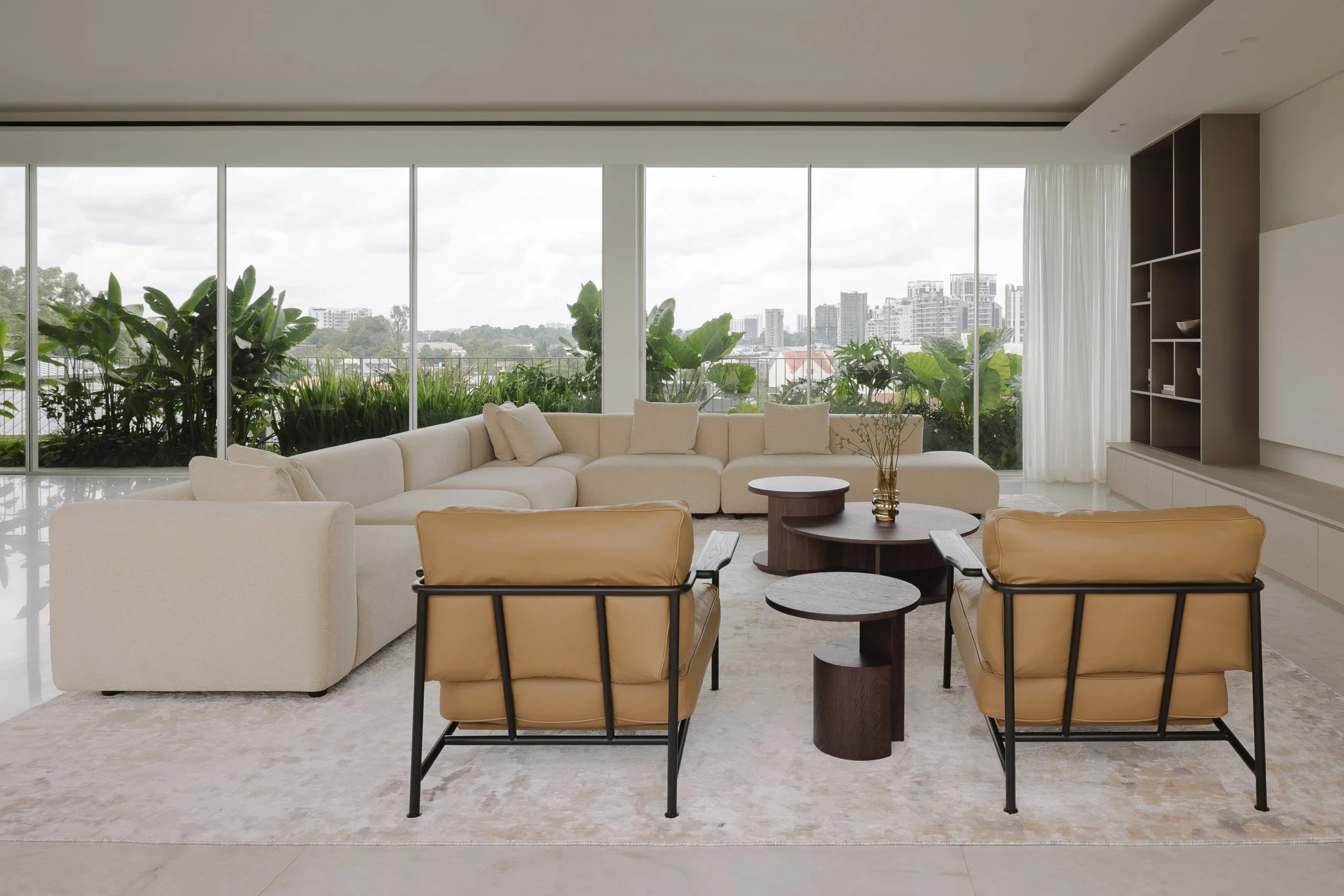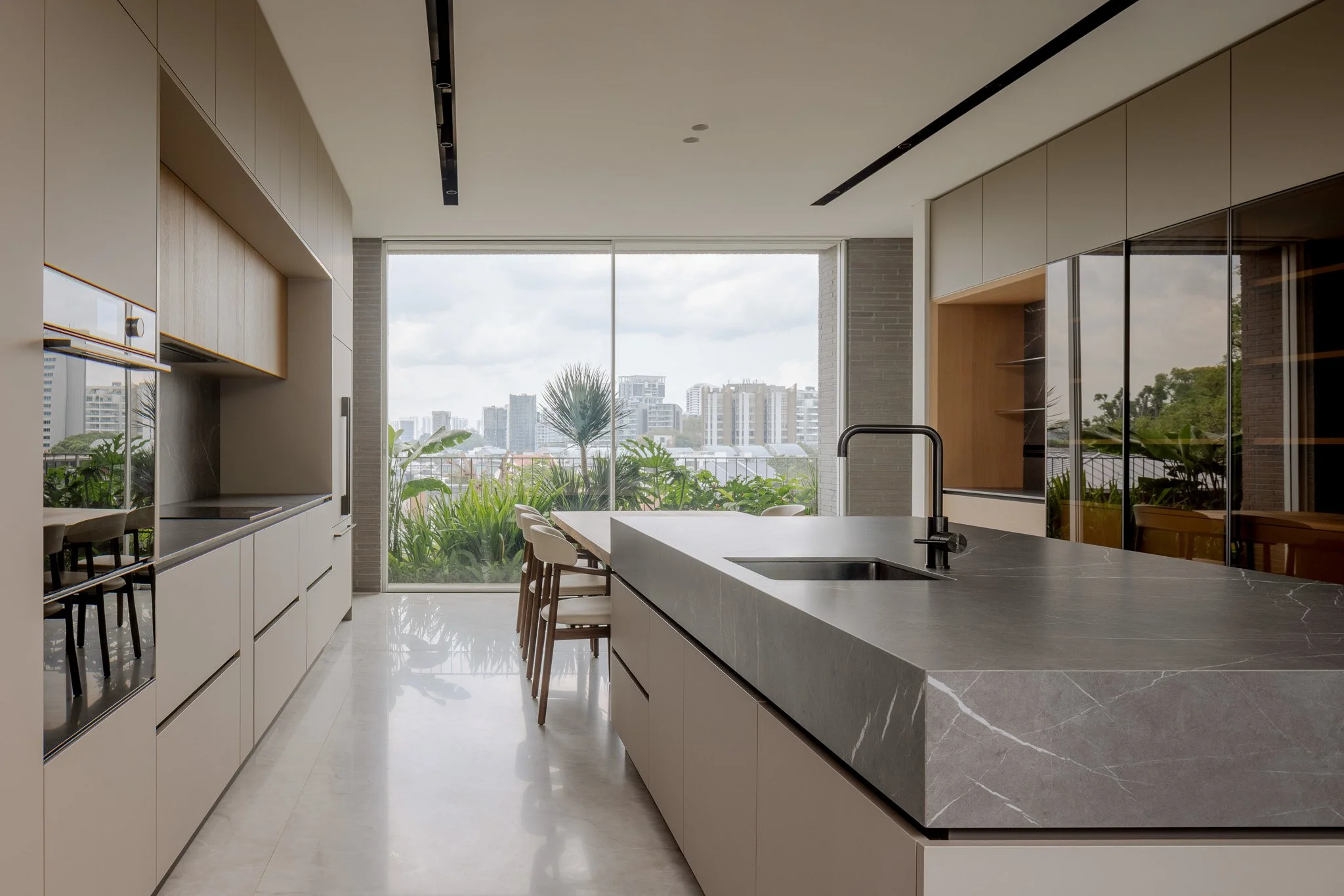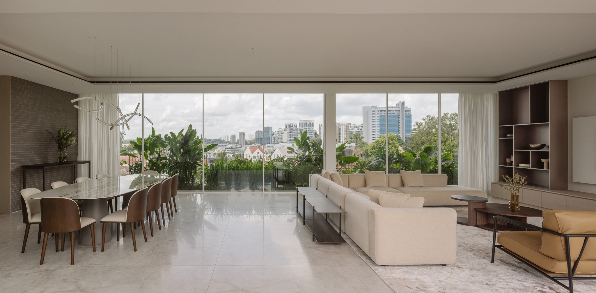 Inside, expansive city views stretch beyond glass walls. Light drifts across polished stone, rich timber, and textured surfaces in the generous living area, the perfect setting for hosting friends amid laughter and lively conversation.