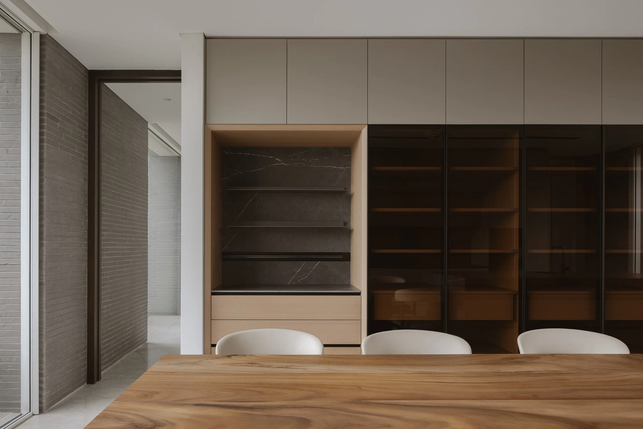 The kitchen is precise and composed, a place for bonding moments as a young family of four moves through daily routines. Floor-to-ceiling doors slide open to the yard, connecting interior and garden to enhance the sense of airiness.