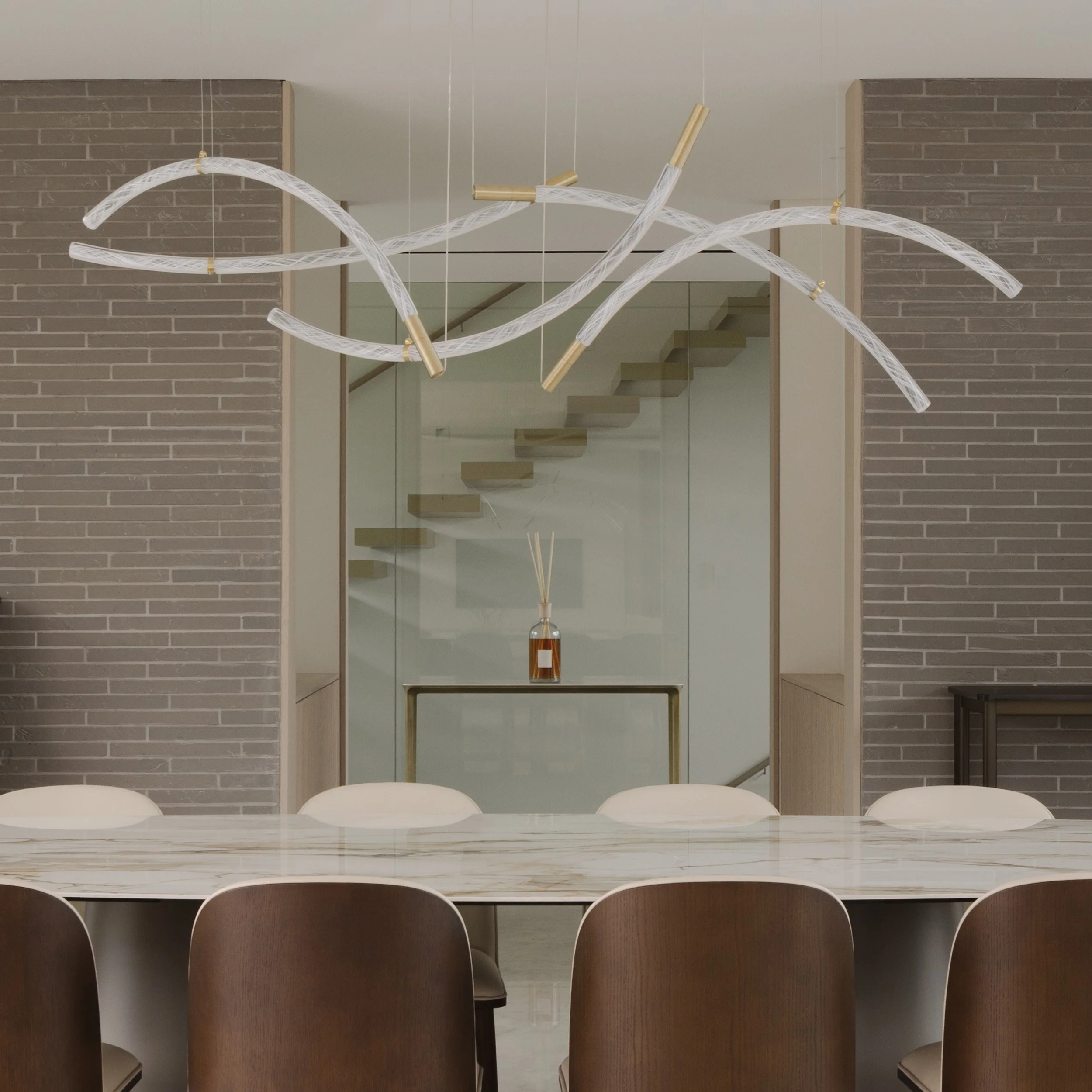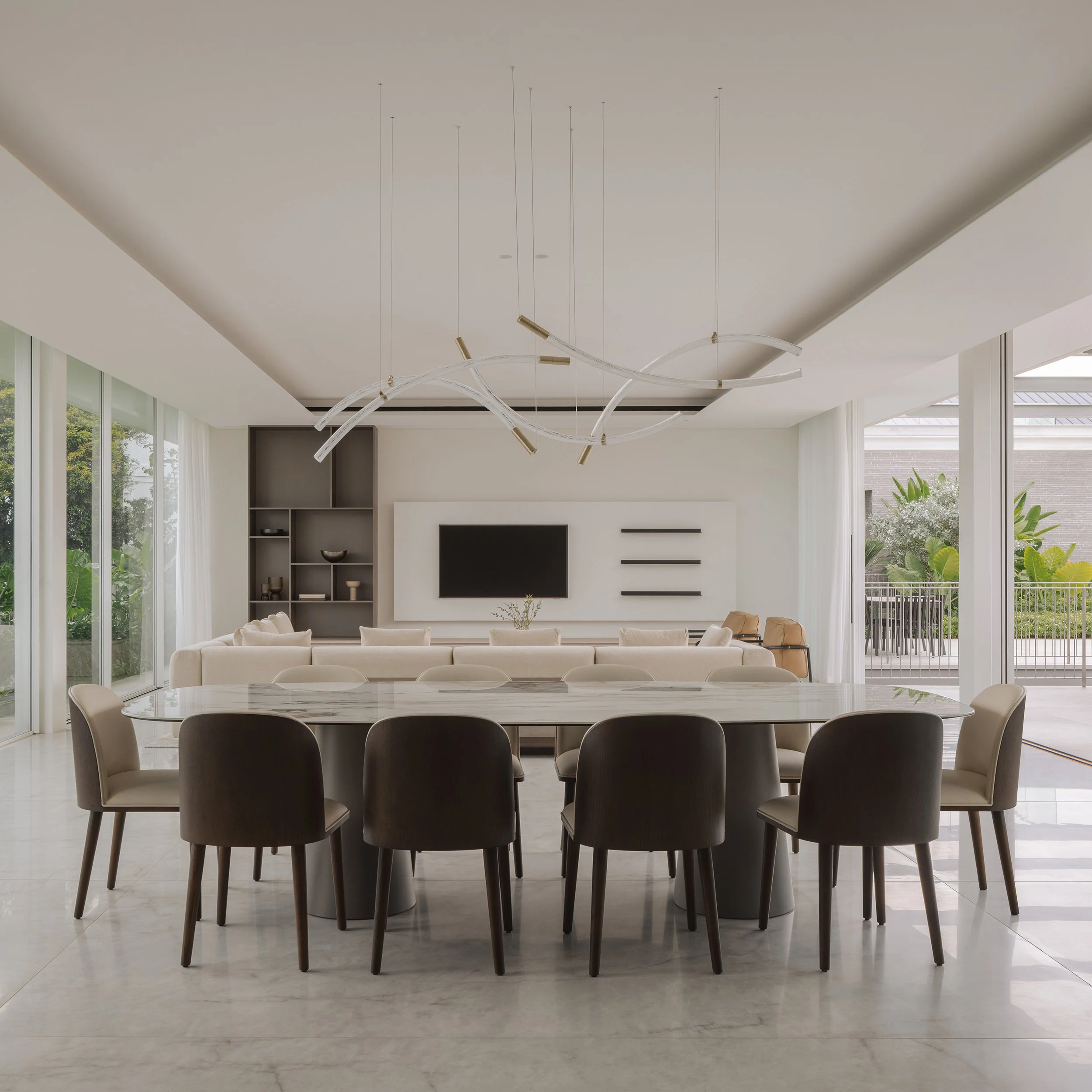 A 10-seater dining table sits gracefully in the space, its elegant stone surface paired with an exquisite crystal chandelier, a personal favourite of the homeowner. Outside, the yard is alive with delicate birdsong and shifting patterns of light across the foliage, the calm of the garden weaving gently into the interior.