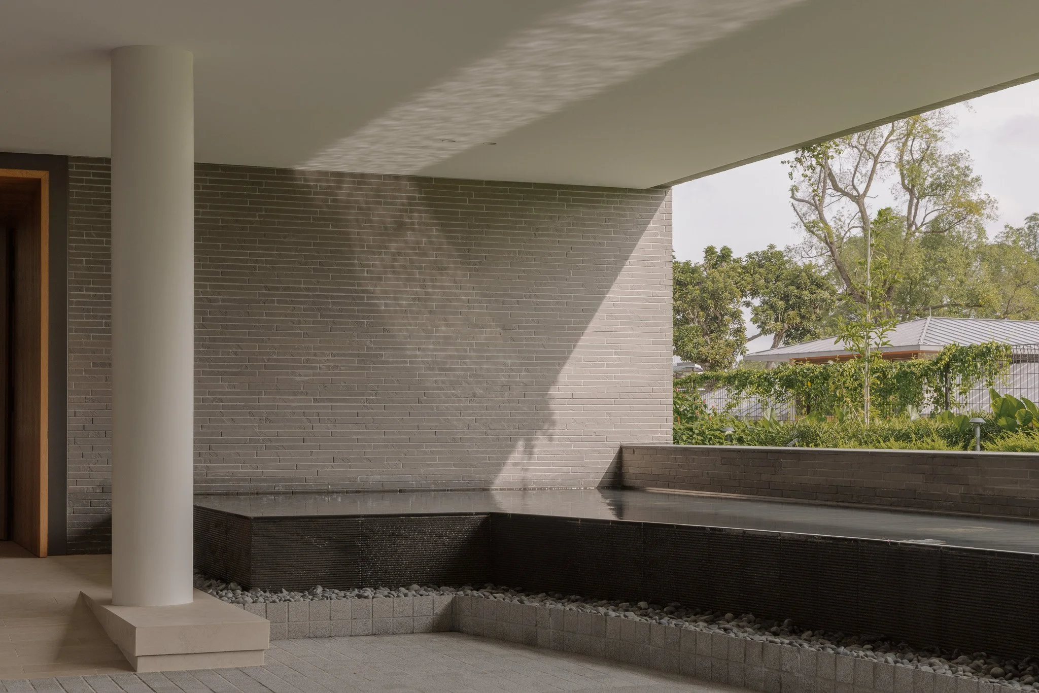 Along the double driveway, a sculptural fountain carries water in steady rhythm, each drop marking a gentle cadence. Soft rays catch the metallic surfaces and draw the eye upward toward the light well. Greenery frames the edge of the property as sunlight shimmers off a second water feature outside the large timber doors, hinting at the calm within.
